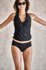 Tankini halter top with a scrunch in between the bust, ties around the neck, made from soft, elastic material, Black color.